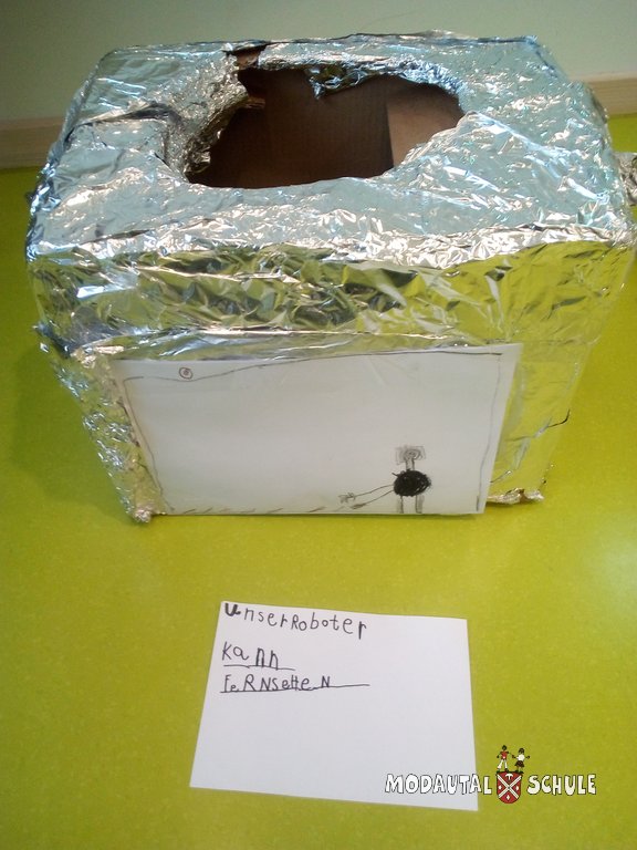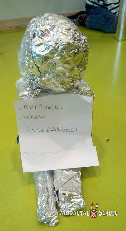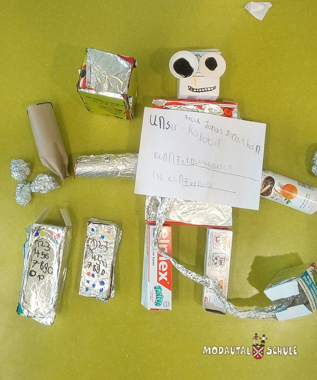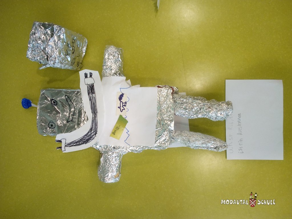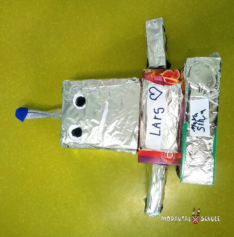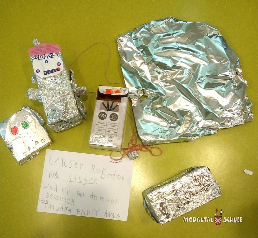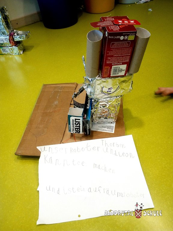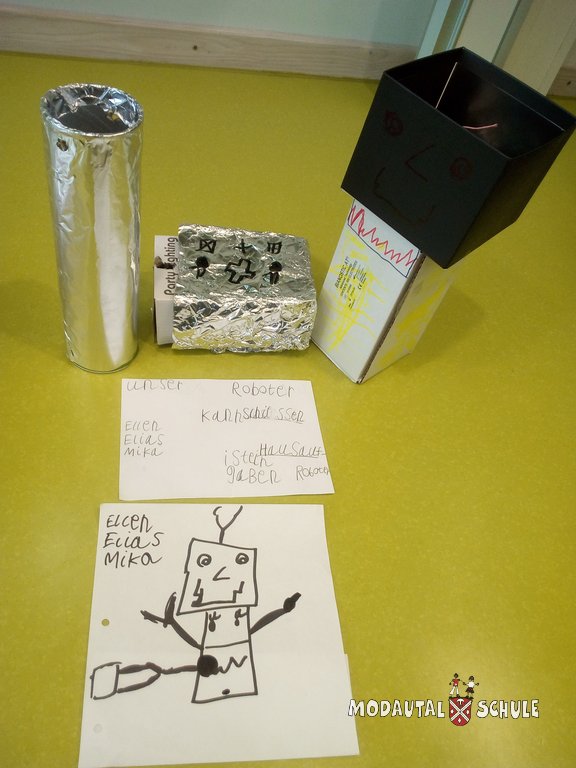 Die Kinder der Froschklasse haben in kleinen Gruppen tolle Roboter erfunden und gebastelt. Die Ergebnisse haben sie anschließend in der Klasse vorgestellt.